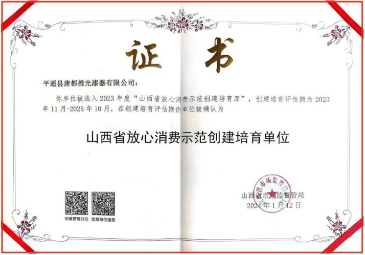 平遙煤化集團唐都推光漆器公司作為平遙縣推光漆器的代表,始終秉承傳統工藝與現代理念相結合的發展理念,堅持為消費者提供高品質的產品和高質量的服務。此次榮獲“山西省放心消費示范創建培育單位”榮譽稱號,不僅是上級管理部門對唐都公司長期以來堅持“誠信經營、質量至上”服務理念的充分認可,更是對企業持續推動消費環境改善,保護消費者權益等工作的高度肯定。